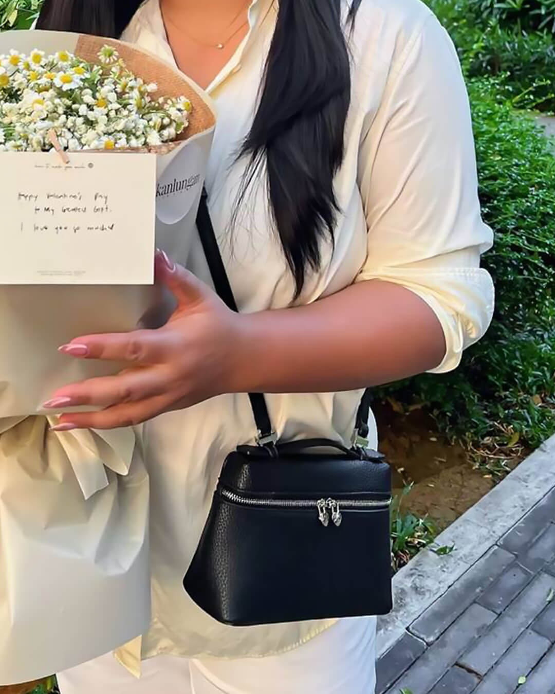 Attira gli sguardi con l'eleganza strutturata e raffinata della nostra La Harper Leather Vanity Bag รจ un accessorio sofisticato, indispensabile per ogni guardaroba moderno. Realizzata con maestria in pregiata ecopelle dalla texture liscia e raffinata, questa borsa compatta ma d'impatto unisce uno stile senza tempo a una funzionalitร  quotidiana. Il manico superiore aggiunge un tocco elegante e femminile, mentre la tracolla staccabile offre la massima versatilitร  per un utilizzo a mani libere, ideale sia per le giornate intense che per le serate fuori. La chiusura con zip dorata e il mini lucchetto donano un accento di lusso al tuo look. Dalle dimensioni perfette per contenere l'essenziale, la La borsa Harper si adatta perfettamente a ogni occasione, passando con facilitร  da brunch e passeggiate in cittร  a eventi serali, diventando cosรฌ la tua scelta ideale per un minimalismo raffinato e un fascino impeccabile. Questa borsa di tendenza รจ pensata per chi cerca uno stile elegante e versatile, perfetta per completare ogni outfit con un tocco di classe e modernitร .